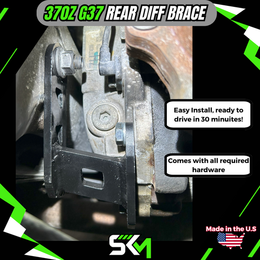 Custom fabricated parts by SKM for the 370z and G37 such as a Rear Differential Brace that adds rigidity and helps support the rear diff. We also offer a long reach racing rear tow hook that bolts into the factory location.